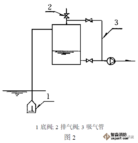 在真空罐吸水管上設底閥時(公眾號:泵管家),其容積可減少很多,如果在水泵吸水管和真空罐排氣管之間再連接一條吸氣管,如圖二所示,不僅能減小罐容積,而且能保持水泵長期穩定運行。吸氣管的作用是將由水中分離出來的氣體及時隨水流排走,不會積存于罐內, 這樣可長期穩定運行(公眾號:泵管家)。
