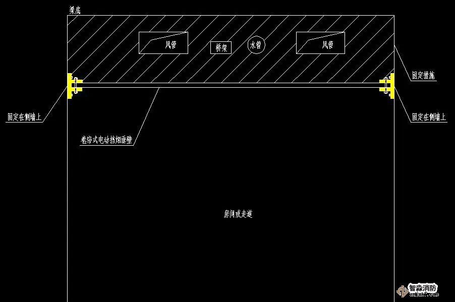 先在梁底設置一定高度的密封固定措施,供機電管線穿過,再將擋煙垂壁安裝在固定設施下方