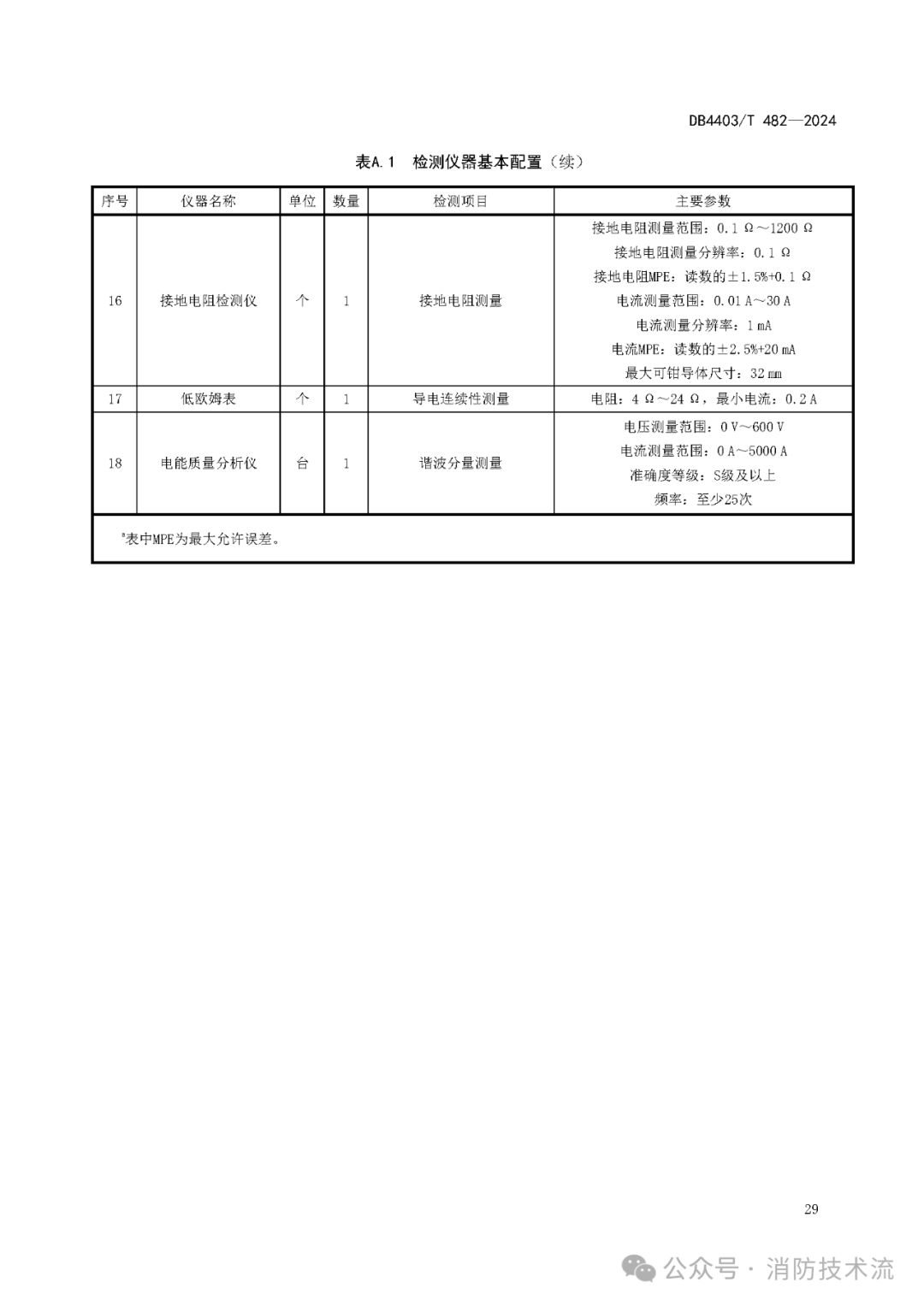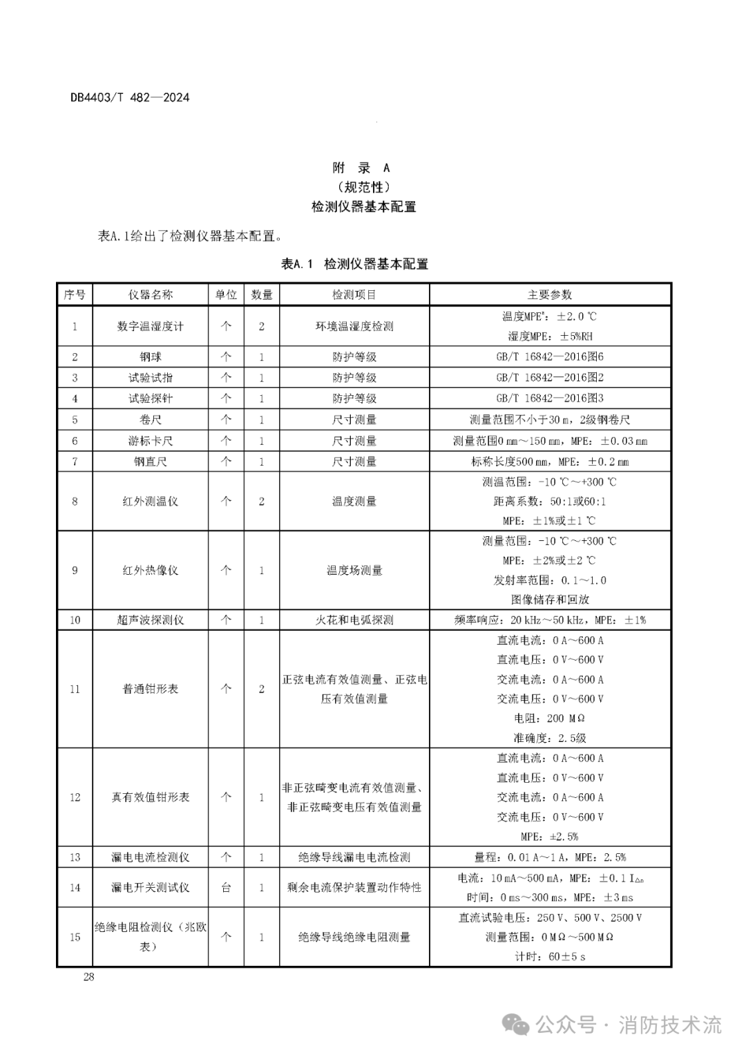 本文件規定了建筑電氣防火檢測的基本要求、檢測流程、檢測要求、建筑電氣火災危險及其等級評定、檢測記錄、試驗報告及檔案管理。本文件適用于交流10(20)kV及以下、直流額定電壓1500 V及以下電氣防火檢測。本文件不適用于生產和儲存火藥、炸藥、火工品和其他有爆炸危險場所,以及井下、航空、水上場所的電氣防火檢測活動。下列文件中的內容通過文中的規范性引用而構成本文件必不可少的條款。其中,注日期的引用文件,僅該日期對應的版本適用于本文件;不注日期的引用文件,其最新版本(包括所有的修改單)適用于本文件。GB/T 2099.1 家用和類似用途插頭插座 第1部分:通用要求GB/T 7260.1 不間斷電源系統(UPS) 第1部分:安全要求GB 8624—2012 建筑材料及制品燃燒性能分級GB/T 18487.1 電動汽車傳導充電系統 第1部分:通用要求GB/T 13539.1 低壓熔斷器 第1部分:基本要求GB/T 13955—2017 剩余電流動作保護裝置安裝和運行GB 14050—2008 系統接地的型式及安全技術要求GB/T 16842—2016 外殼對人和設備的防護 檢驗用試具GB/T 16895.6—2014 低壓電器裝置 第5-52部分:電氣設備的選擇和安裝 布線系統(IEC 60364-5-52:2009,IDT)GB/T 31038 高電壓柴油發電機組通用技術條件GB/T 42710.1 家用和類似用途直流插頭插座 第1部分:通用要求GB 50171—2012 電氣裝置安裝工程 盤、柜及二次回路接線施工及驗收規范GB 50303—2015 建筑電氣工程施工質量驗收規范電氣設備 electrical equipment用電設備 current-using equipment用于將電能轉換成其他形式能量的電氣設備(3.1)。電氣裝置 electrical installation由相關電氣設備(3.1)組成的,具有為實現特定目的所需的相互協調的特性的組合。電氣設備(3.1)或電氣線路發生電氣故障而引發的火災。在系統、裝置或設備的給定點與局部地之間進行電連接。[來源:GB/T 2900.1—2008,3.5.6]將已停電的帶電部分接地(3.5)、以便在無電擊危險情況下進行作業。保護接地 protective grounding為了電氣安全,將系統、裝置或設備的一點或多點接地(3.5)。[來源:GB/T 2900.1—2008,3.5.9]埋入土壤或特定的導電介質(例如混凝土或焦炭)中、與大地有電接觸的可導電部分。[來源:GB/T 2900.1—2008,3.5.17]在系統、裝置或設備的給定點與接地極(3.8)或接地網之間提供導電通路或部分導電通路的導體。[來源:GB/T 2900.1—2008,3.5.19]被接地體與地下零電位面之間接地引線電阻、接地器電阻、接地器與土壤之間的過渡電阻和土壤的溢流電阻總和。[來源:GB/T 2900.1—2008,3.2.55b﹚]保護導體 protective conductor[來源:GB/T 2900.1—2008,3.5.24]兼有保護接地(3.7)導體和中性導體(3.12)功能的導體。[來源:GB/T 2900.1—2008,3.5.27]等電位聯結 equipotential bonding[來源:GB/T 2900.1—2008,3.5.8]等電位聯結導體 equipotential bounding conductor用于保護等電位聯結(3.15)的保護導體(3.13)。剩余電流保護裝置 residual current protective device在正常運行條件下能接通、承載和分斷電流,以及在規定條件下當剩余電流達到規定值時能使觸頭斷開的機械開關器件。以傳導或無線方式與電動汽車或動力蓄電池連接,為其提供電能的設備。在建筑內部采用防火墻(3.21)、耐火樓板及其他防火分隔設施分隔而成,能在一定時間內防止火災向同一建筑的其余部分蔓延的局部空間。[來源:GB/T 5907.2—2015,2.1.3]防止火災蔓延至相鄰建筑或相鄰水平防火分區(3.20)且耐火極限不低于3.00 h的不燃性實體墻。[來源:GB/T 5907.2—2015,2.1.6]公共娛樂場所 public entertainment occupancies具有文化娛樂、健身休閑功能并向公眾開放的室內場所。注:公共娛樂場所包括影劇院、錄像廳、禮堂等演出、放映場所,舞廳、卡拉OK廳等歌舞廳娛樂場所,具有娛樂功能的夜總會、音樂茶座、酒吧和餐飲場所,游藝、游樂場所,保齡球館、旱冰場、桑拿等娛樂場所、健身、休閑場所和互聯網上網服務營業場所。可能導致火災發生或火災危害增大的各類潛在不安全因素。4.1.1電氣設備表面應保持清潔,電氣設備及線纜的外觀應完好、無裂紋、破損、燒蝕等現象,外殼、漆層、手柄應無損或變形,緊固件無松動。4.1.2電氣裝置應有銘牌標識且應齊全、清晰、易見,實行生產許可證或強制性認證(CCC認證)的設備,應有許可證編號或CCC認證標志或應能提供相應的質量合格證明文件。4.1.3運行中的電氣設備的周圍環境應符合產品的技術要求,周圍應無易燃易爆物品及其他雜物,無滲水、漏水現象。4.1.4電氣設備及線路不應直接安裝在可燃材料上。4.1.5電氣設備的外部接線應按接線端頭標識進行,每個接線端子的每一側應接一根導線,最多不應超過2根導線。4.1.6裸帶電導體與電氣設備連接時,其電氣間隙不應小于與其直接連接的電器元件的接線端子的電氣間隙。4.1.7電氣設備的外露可導電部分應單獨與保護導體相連接。不應串聯連接,連接導體的材質、截面積應符合設計要求。4.1.8電氣裝置和設備的額定電壓、額定電流、額定頻率應與所在回路相適應,不應過負荷使用。需要接地的電氣設備金屬外殼,應可靠接地。4.1.9建筑電氣防火檢測應在電氣設備和線路經過1 h以上時間的有載運行,進入正常熱穩定工作狀態,其溫度變化率小于1 ℃/h后進行。4.1.10檢測儀器的基本配置和主要技術性能參數應符合附錄A的規定。4.2.1檢測機構應為獨立法人,有固定的辦公場所。4.2.3應配備檢測所需要的人員、設備及技術支持服務。4.2.5應遵循客觀、獨立、公平公正、誠