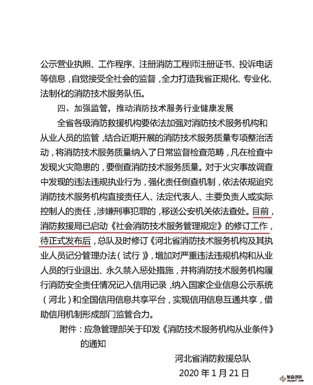 河北省《消防技術服務機構從業條件》已經實施有一段時間,目前全國社會消防技術服務機構都必須遵從《從業條件》的規定,但《從業條件》與早幾年發布的《社會消防技術服務管理規定》(公安部令第129號)內容不一致,甚至大相徑庭,因此《社會消防技術服務管理規定》需要修改是無可避免的。根據河北省消防救援總隊關于落實《消防技術服務機構從業條件》有關事項的通知,目前消防救援局已經啟動《社會消防技術服務管理規定》修改工作,靜待其正式發布。