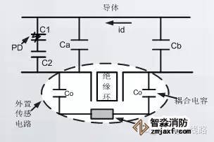 在電纜的中間接頭,測試原理如圖所示,一側電纜的鎧裝與電纜導體之間存在電容Ca,另一側電纜的導體與鎧裝之間存在電容Cb,如果在電纜的中間接頭發生局部放電,那么形成兩個電容C1和C2,此時Ca和Cb就會通過導體向C1和C2充放電,從而形成局放電流回路,在兩側電纜屏蔽層橋接一個高頻低阻的電容臂C0和高頻電流傳感器,就可以檢測到局放的脈沖電流信號。